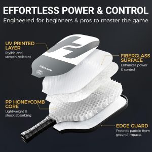 - 💪【Durable Fiberglass Face + PP Honeycomb Core】Built with a premium fiberglass surface and a lightweight polypropylene honeycomb core, this paddle offers superior power, control, and shock absorption—perfect for players of all levels who want to improve their game.